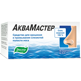 Средство для орошения и промывания слизистой полости носа АкваМастер Эвалар (морская соль в пакетиках-саше) предназначено для профилактики и использования в комплексном лечении ЛОР- заболеваний взрослых и детей старше 3-х лет. Применяется с целью изготовления раствора для орошения и промывания слизистой полости носа.
