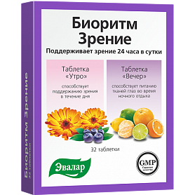 Биоритм Зрение – это не просто витамины, а целый комплекс необходимых для глаз микроэлементов и биологически активных веществ, в том числе таурина, которые для лучшего усвоения разделены на две таблетки – утреннюю и вечернюю для приема в разное время суток в соответствии с биоритмами человека.