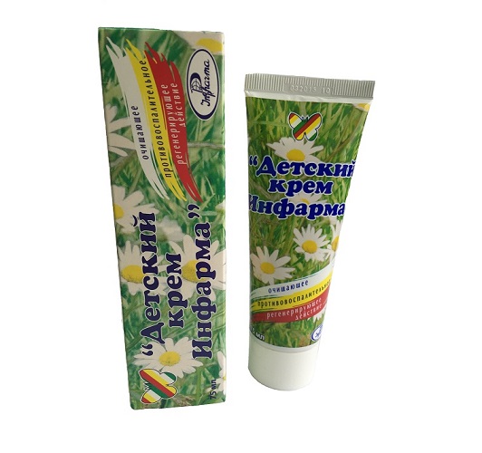 Детский крем ИНФАРМА, предназначенный для ухода за кожей при экземе, дерматите, псориазе, опрелостях и ожогах кожи, юношеских угрях. Крем содержит масляные и водные экстракты трав череды, ромашки, чистотела, витамины А, Е, аминокислоты. Высокая эффективность «Детского крема» связана не только с его составом, но и с тщательно подобранным рН и особой технологией приготовления, обеспечивающей эмульсию, напоминающую водно-жировую эмульсию кожи здорового ребенка, не препятствующую испарению влаги и кожному дыханию.