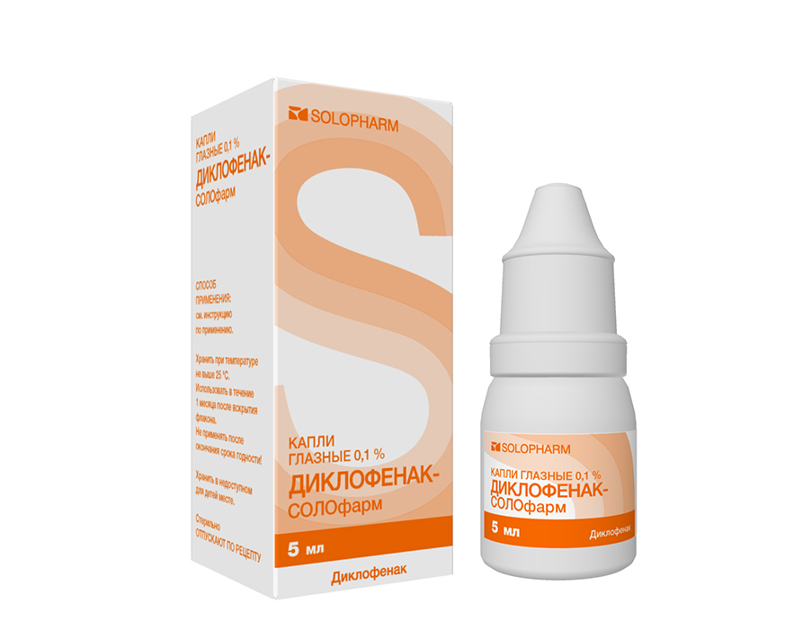 При местном применении в форме глазных капель диклофенак уменьшает воспаление глаз, возникающее в результате инфекции, травмы или хирургической операции; уменьшает миоз при хирургических операциях, снижает синтез простагландинов во влагу передней камеры.