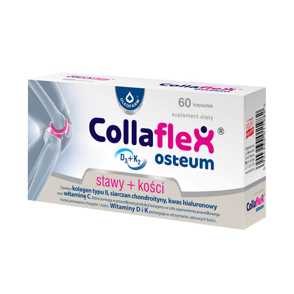 Collaflex Osteum - препарат, рекомендованный для людей, которые поддерживают здоровый хрящ и здоровые кости, особенно для пожилых людей и людей, активно занимающихся спортом. Содержит Collatrin®, который обеспечивает компоненты, обнаруженные в хряще: коллаген типа II, хондроитинсульфат и гиалуроновая кислота. Кроме того, он содержит витамины C, D 3 и K 2 . Витамин С помогает в правильном производстве коллагена для обеспечения надлежащего функционирования хряща и кости, а также помогает защитить клетки от окислительного стресса. Витамин К и витамин D помогают поддерживать здоровые кости.