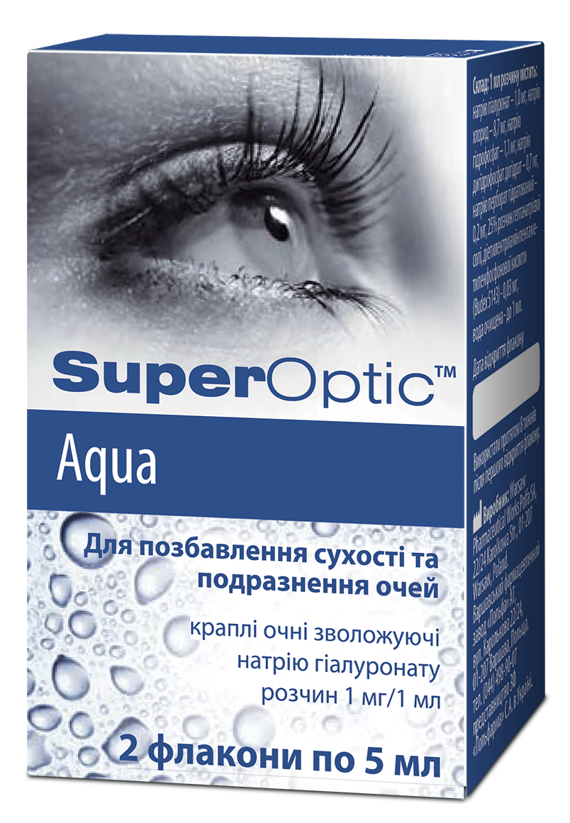 СуперОптиктм Аква - увлажняющие глазные капли, которые обеспечивают эффективное и длительное увлажнение глаз. СуперОптиктм Аква устраняет сухость, раздражение, ощущение усталости и песка в глазах, возникающие: при воздействии раздражающих факторов окружающей среды, таких как: пыль, дым, УФ-излучения, высокая температура в помещении (например, от центрального отопления, сауны), кондиционирования воздуха, ветра, хлорированной воды, косметики.